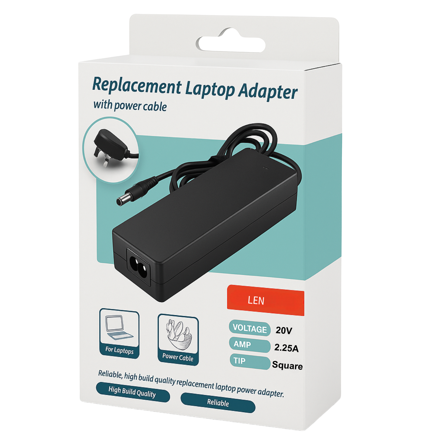 High-quality replacement Lenovo 45W charger, designed for full compatibility with Lenovo IdeaPad, Flex, Yoga, Chromebook, and Winbook models using the 11x4.6mm square USB-style connector. Delivers safe and stable charging with 20V output and 2.25A current for daily use.