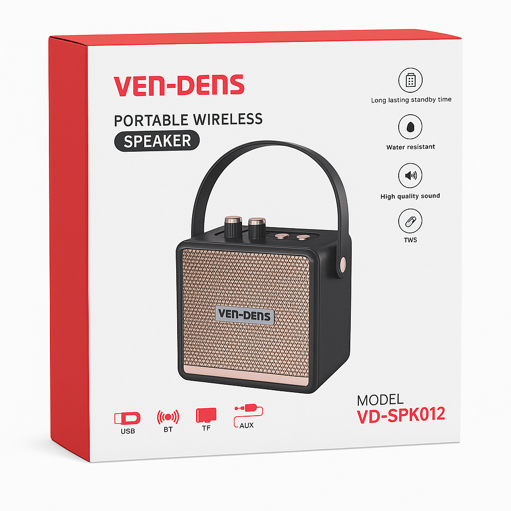 Compact, take-anywhere Bluetooth speaker from Ven Dens. The VD-SPK012 is designed for everyday listening at home, in the office or on the move, with simple wireless pairing and a rechargeable battery in a rugged, portable shell.